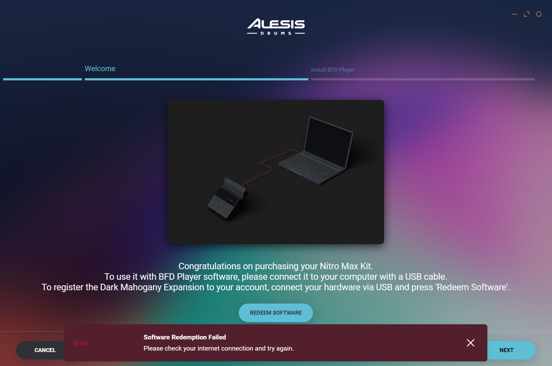 I’ve reached out to support multiple times in the past 14-or-so days and I’ve heard nothing back. I’m getting really upset because I can’t renew my dark mahogany and I suspect that the refusal to connect is the reason why the set won’t make any sound when I use BFDplayer (another issue that I’m having, though not the topic of this post.)