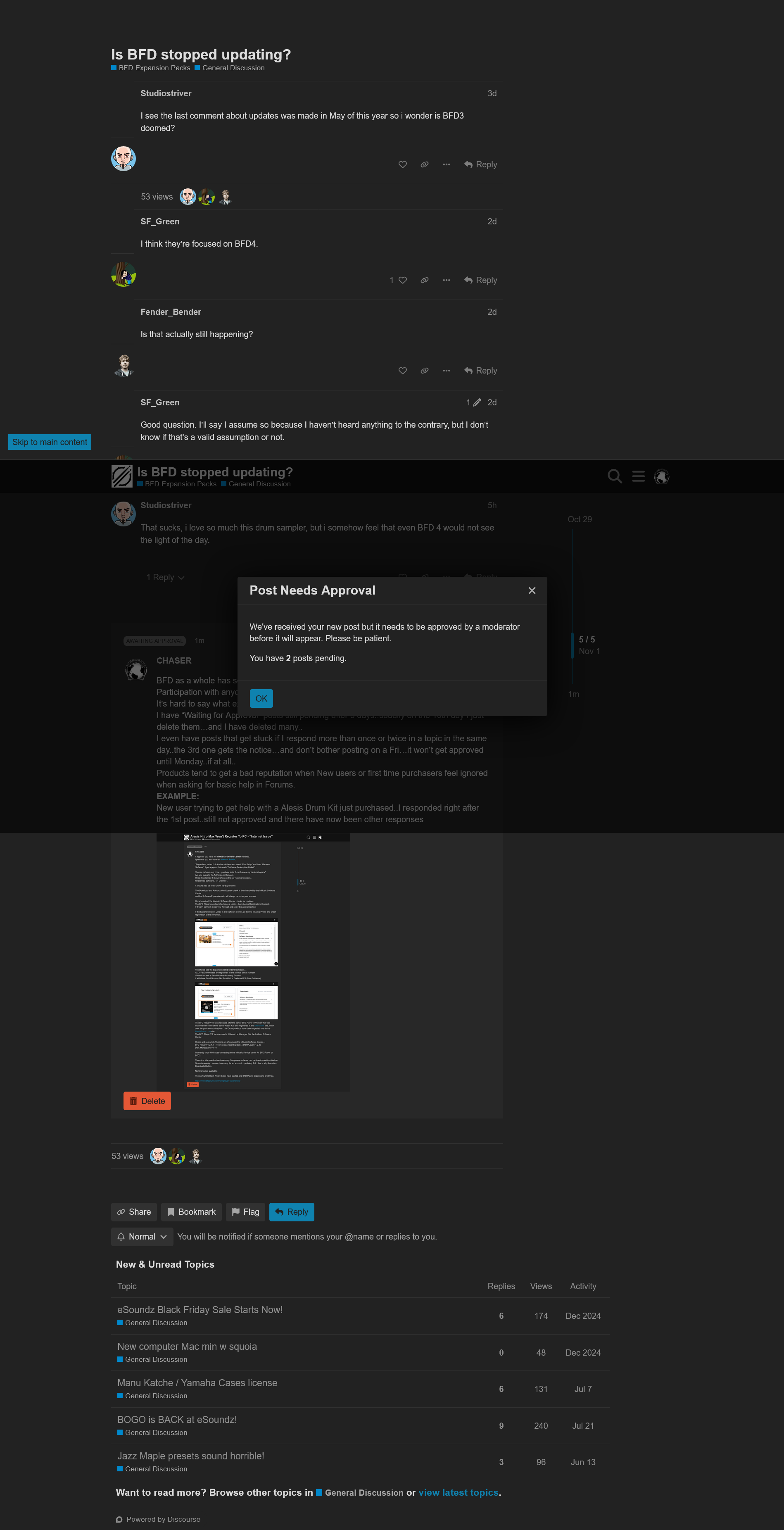 I even have posts that get stuck if I respond more than once or twice in a topic in the same day..the 3rd one gets the notice…and don’t bother posting on a Fri…it won’t get approved until Monday..if at all..