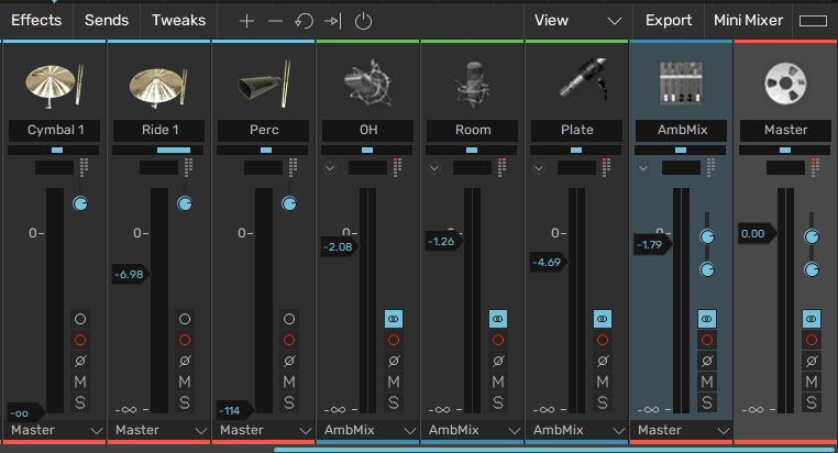 Bear in mind if you adjust the kick channel (for example) that won’t change the amount of kick in your ambient microphones; which is to be expected in a multi-mic’d drumkit setup.